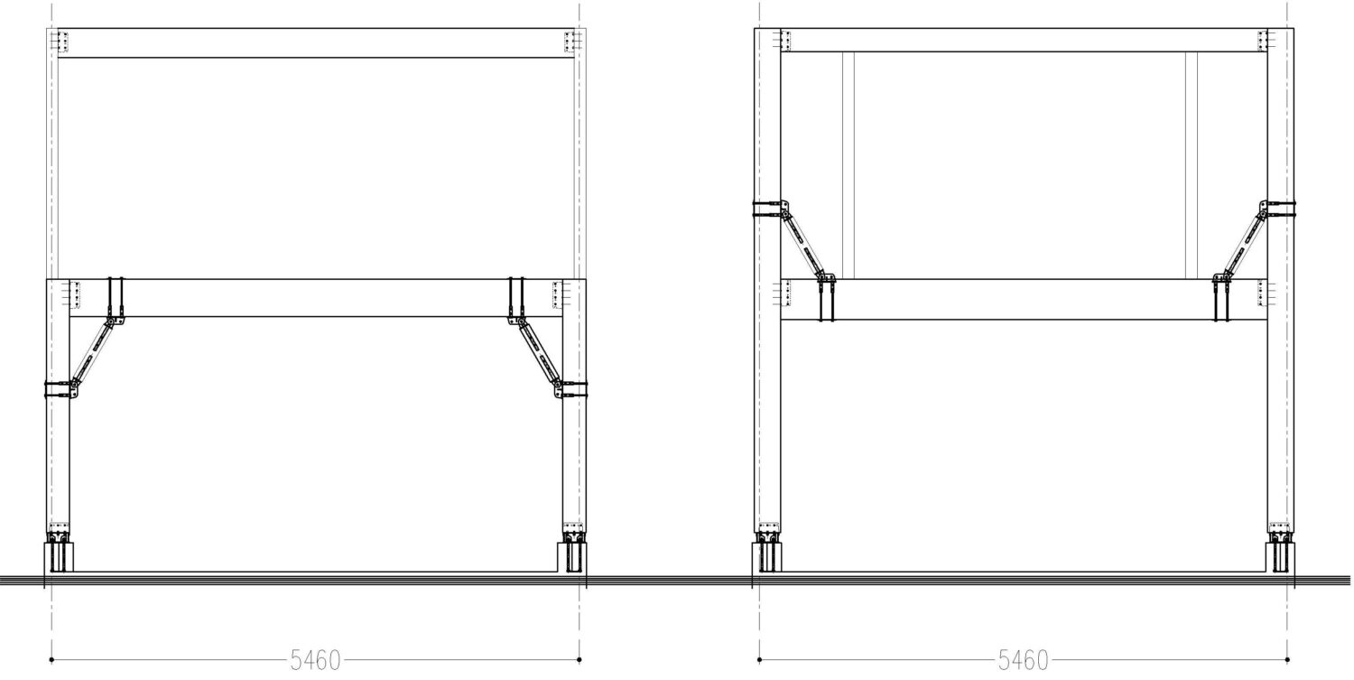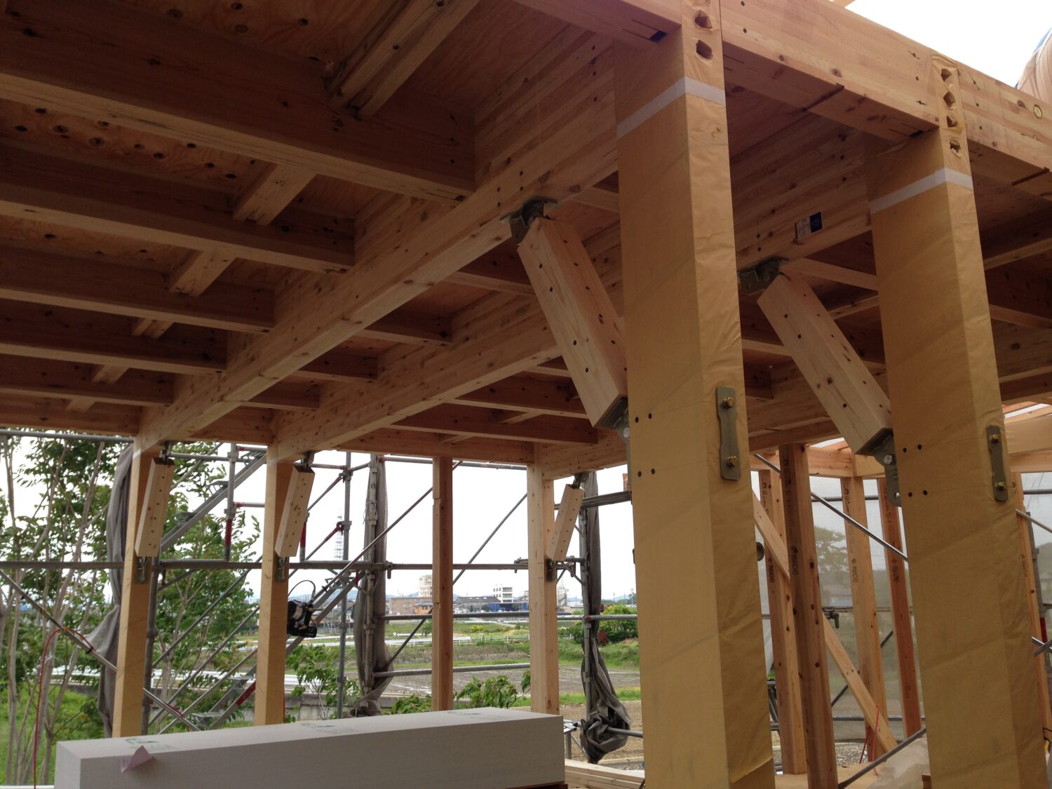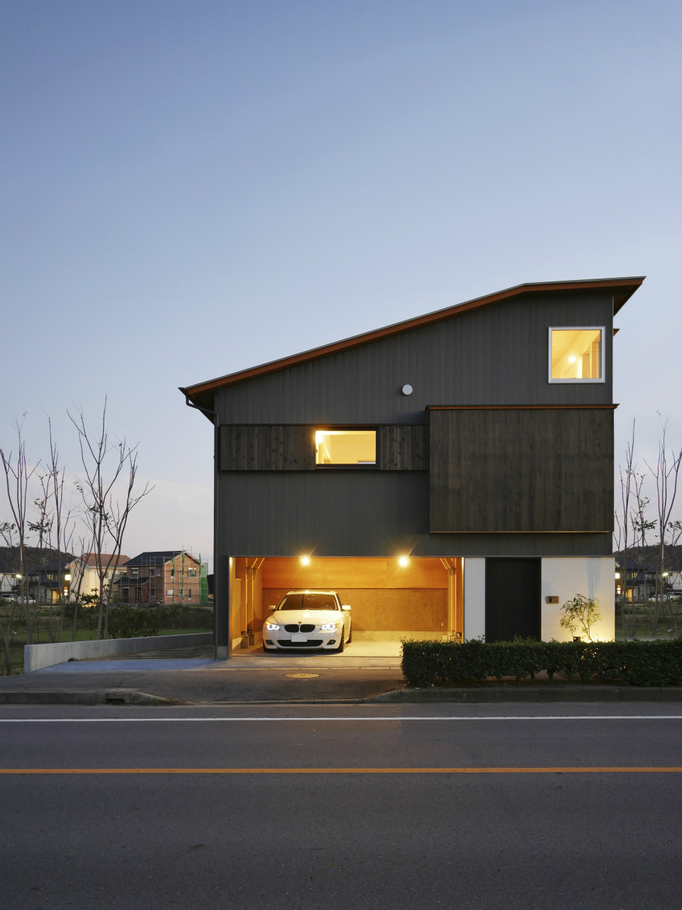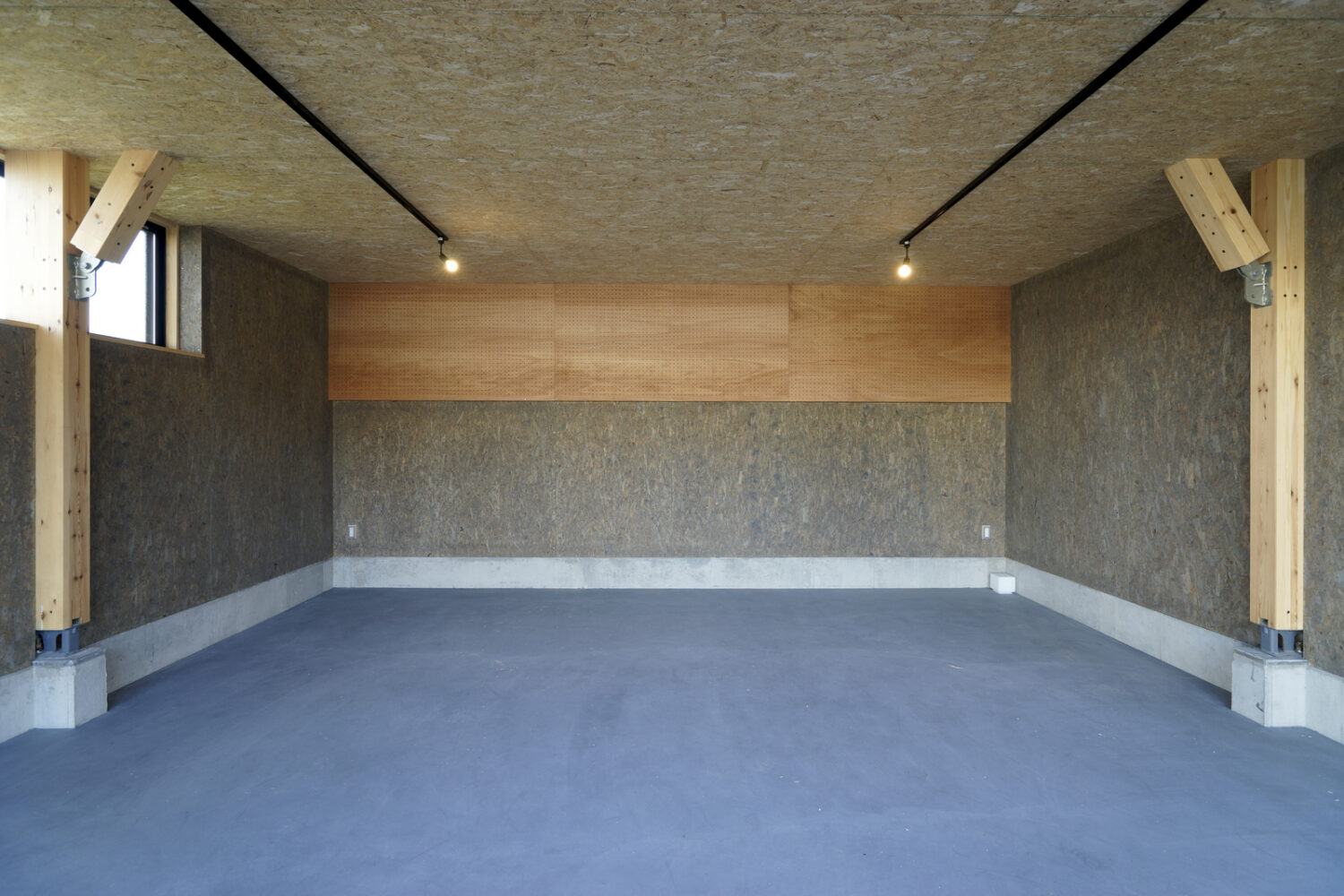 張間方向に耐力壁を配置できないガレージハウスを方杖フレームで計画。シャッターボックスを綺麗に納めるために入り口側の方杖フレームのみフレーム形状を変えて、意匠の要望を実現した例です。