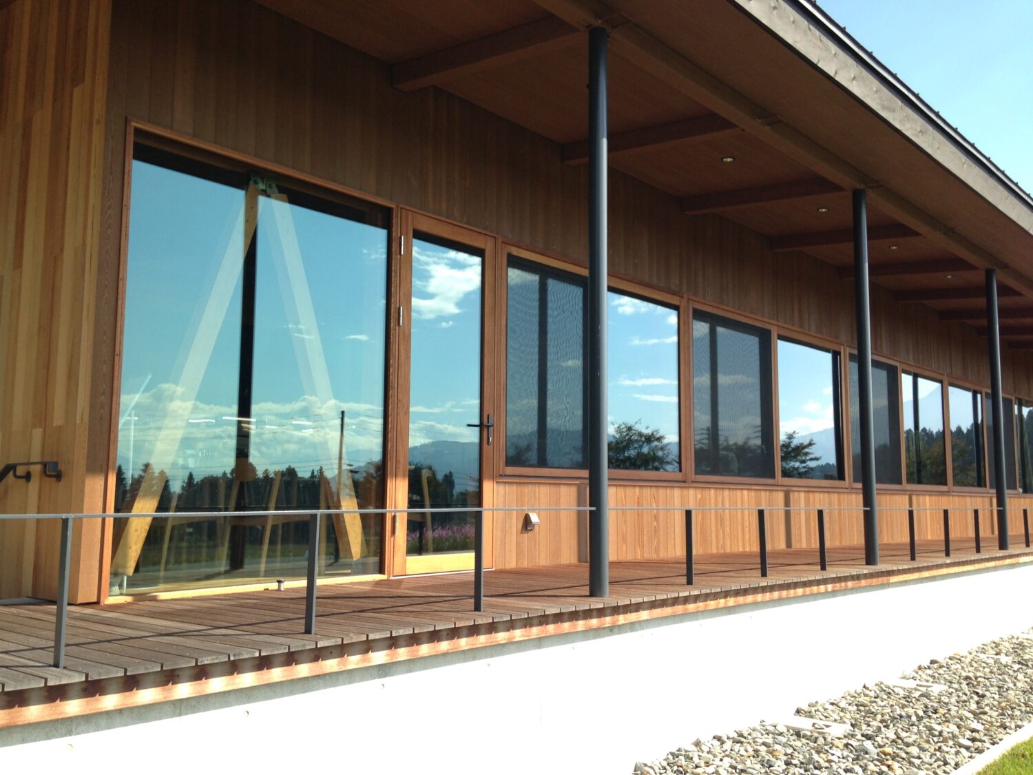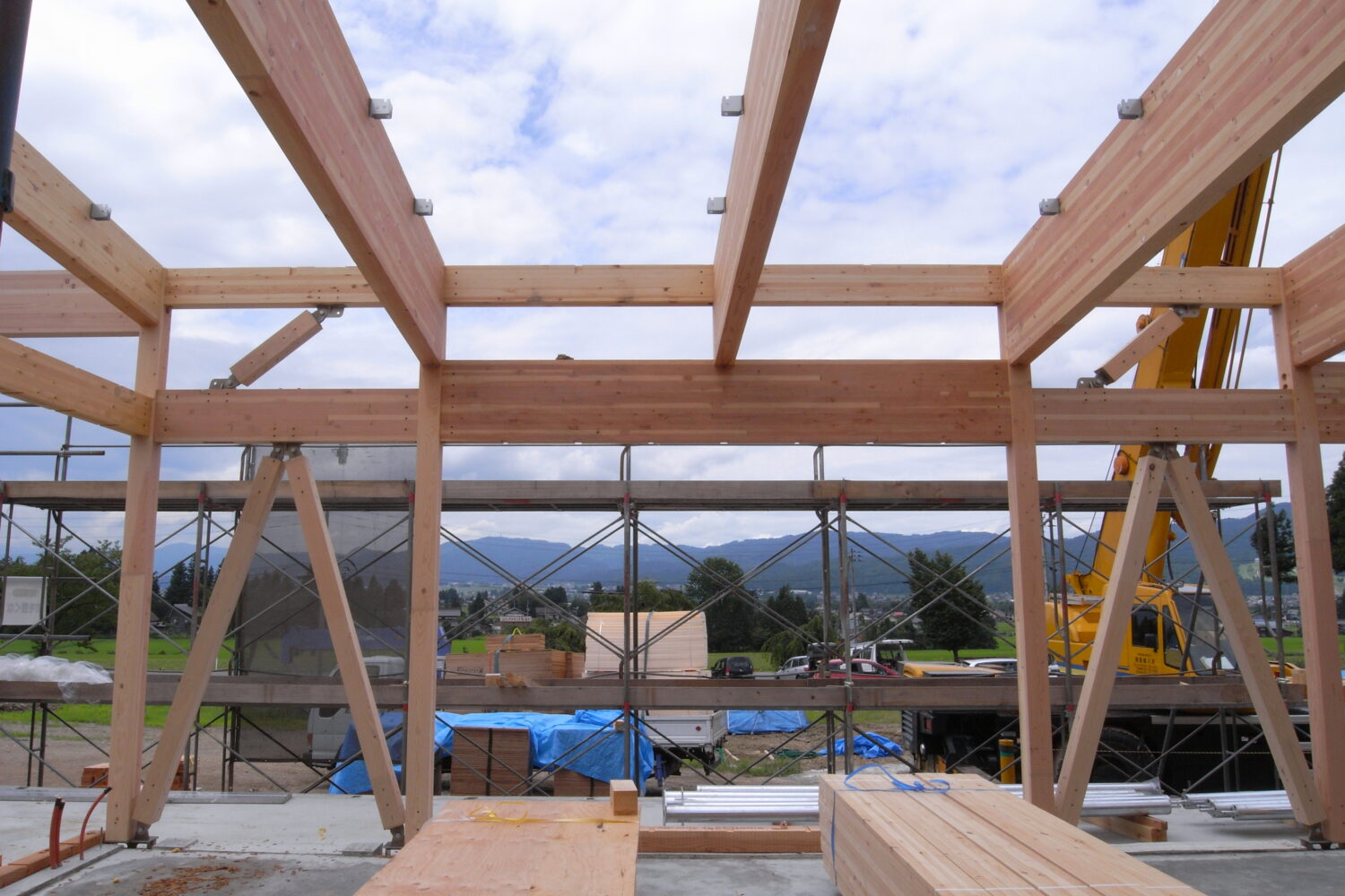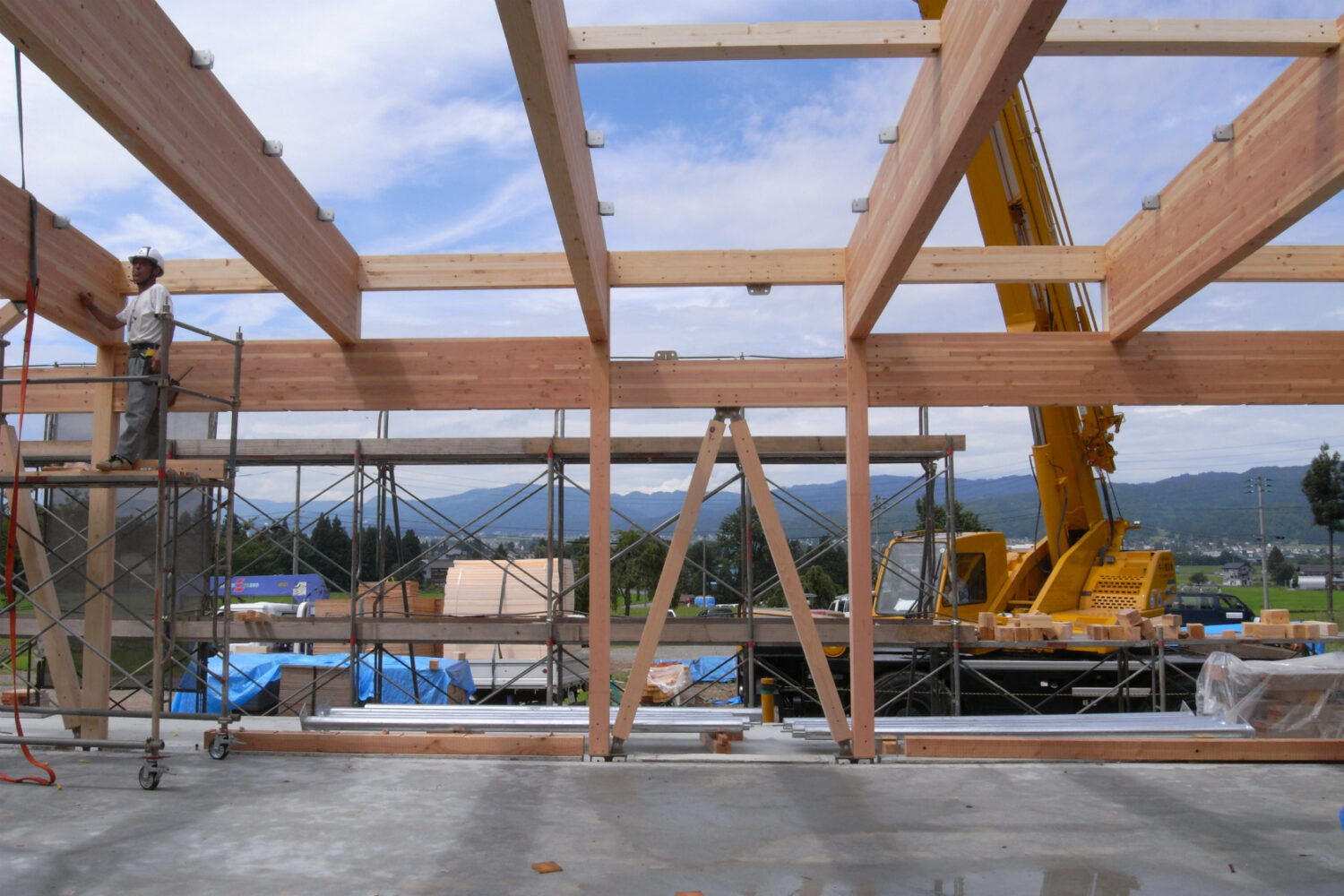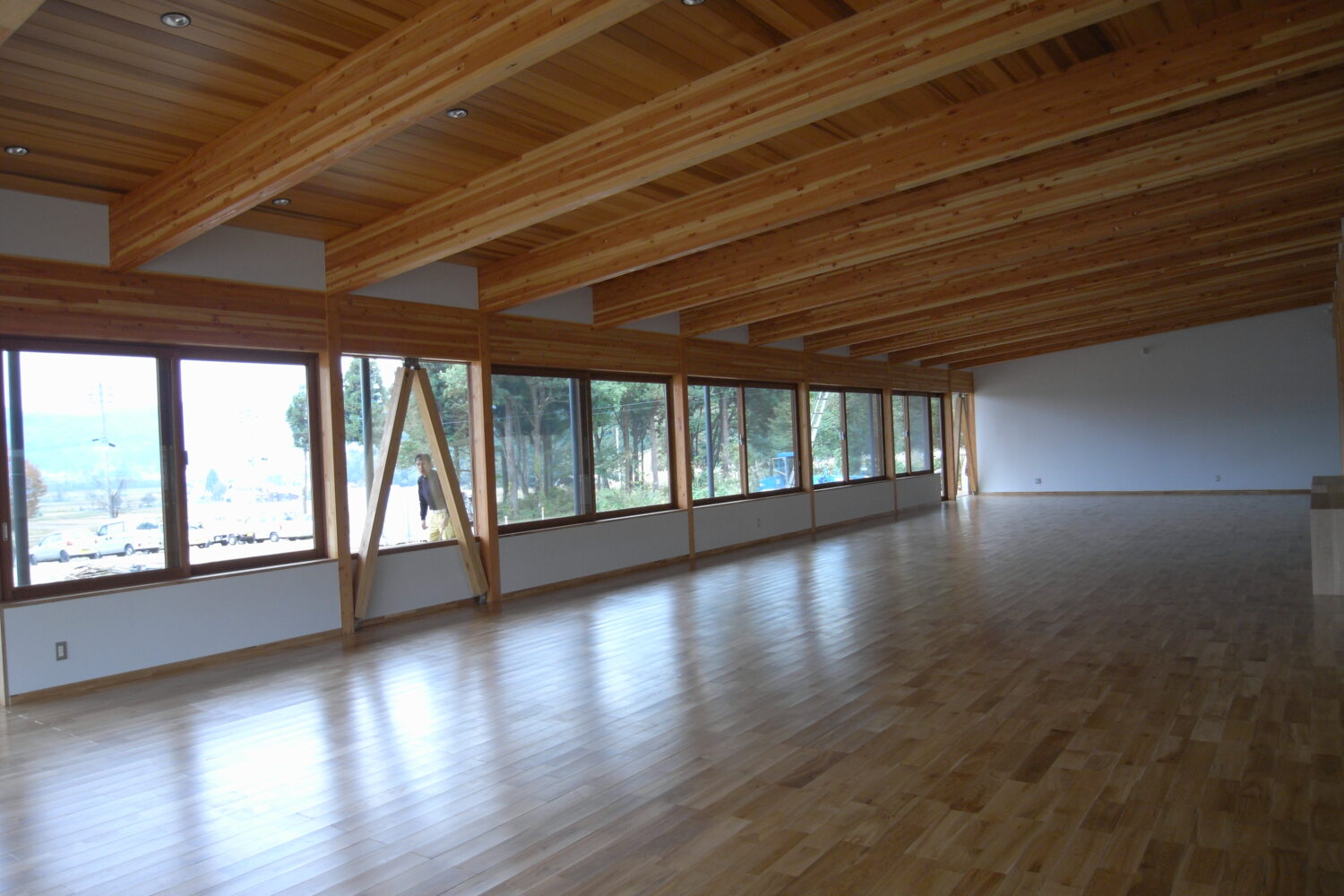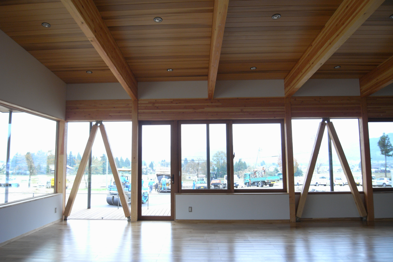 積雪3mの豪雪地帯に建つレストランです。建物前面に広がる美しい田園風景を建物に取り込みたいという意匠設計の意図を「見せる木ブレース」で実現しました。平屋の建物ですが積雪が多いため大きな地震力を処理する必要が有りました。ブレース構造とすることで柱が大きくならずスッキリとしたエレベーションと出来た建物です。積雪3mという厳しい設計条件でしたが、木造でも席数120席のレストランという大空間を実現できました。