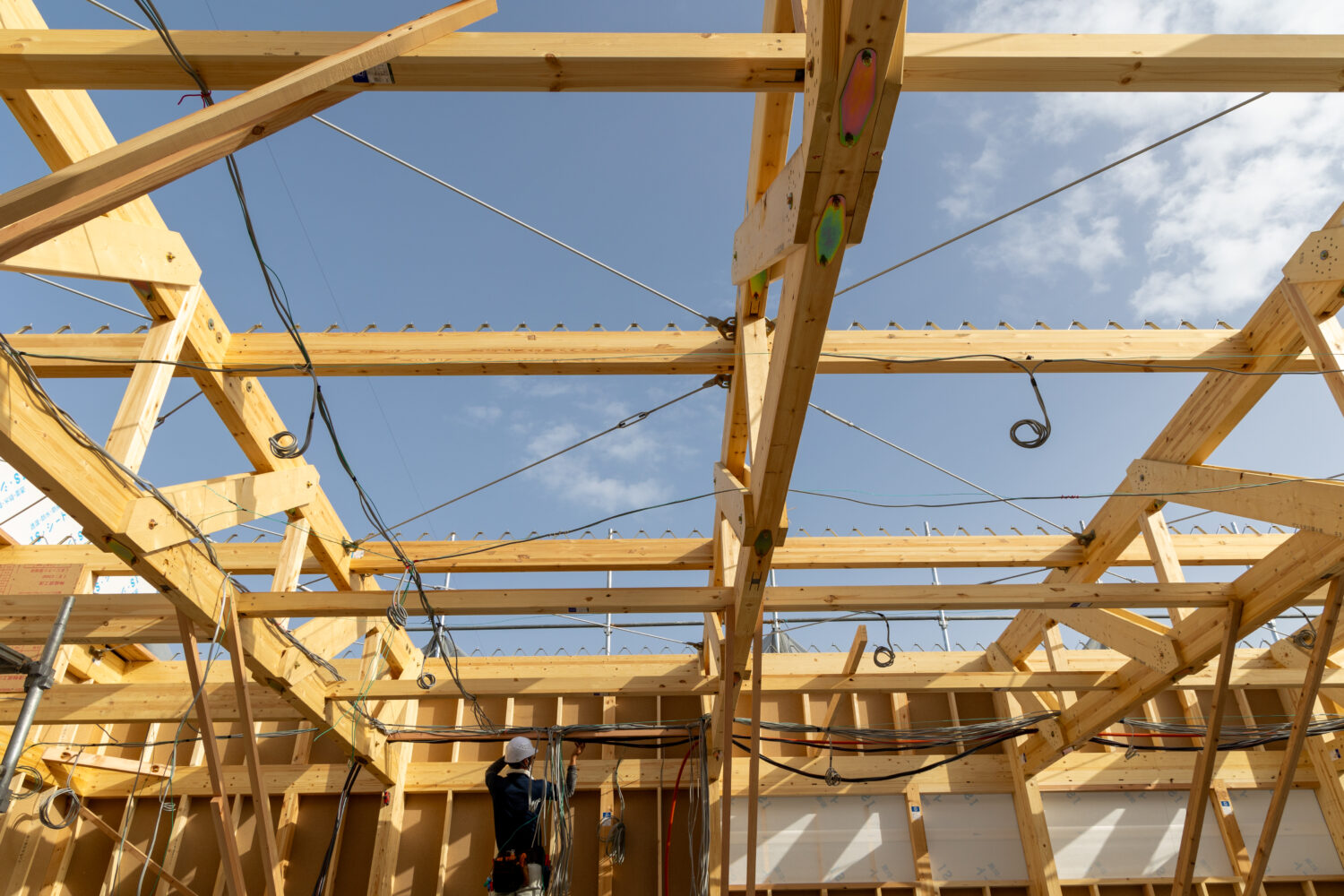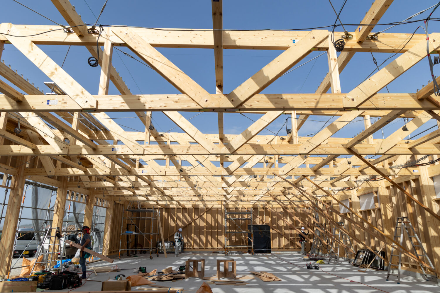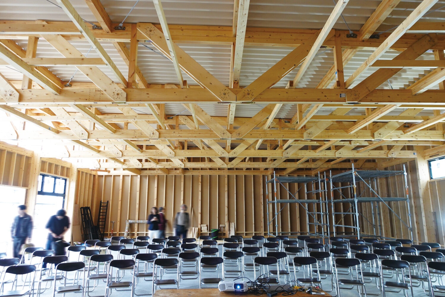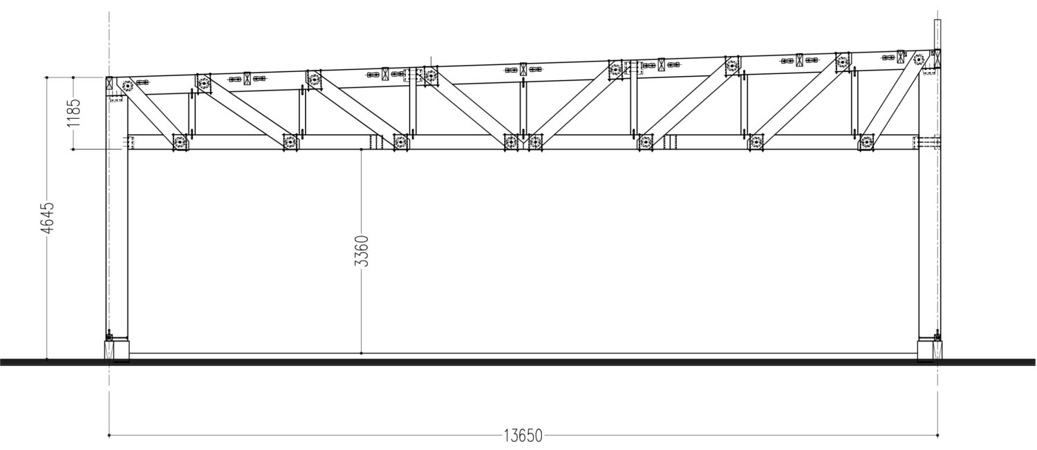 軽量鉄骨で計画された建物ですが、コストダウンを目指して木造化した建物です。積雪30cmのエリアであったことからフレームピッチを2.73mとし躯体費を合理化しました。桁行き長さが約25mと長いことから、鉛直力も水平力も支えることができる自立フレームとして計画したトラス・ラーメンフレームを配置し、張間方向の耐震要素とした計画です。各フレームが耐力壁の役割も兼ねることから高強度な水平構面が不要となります。屋根は折板仕上げである事から水平構面は丸鋼ブレースで構成しコストダウンを実現しています。