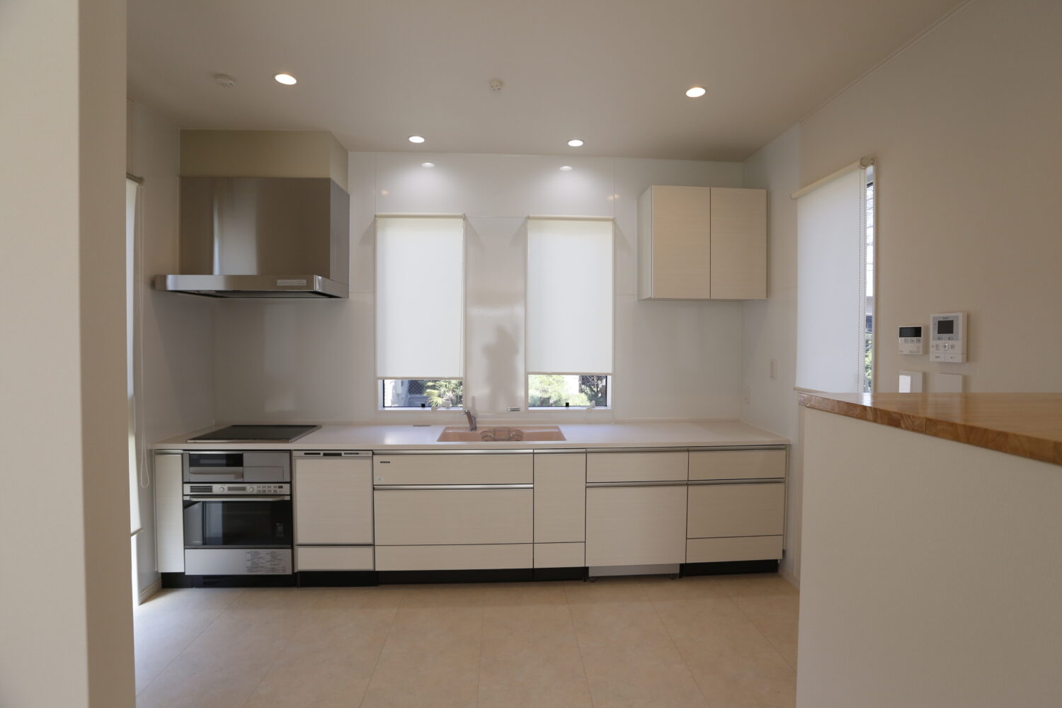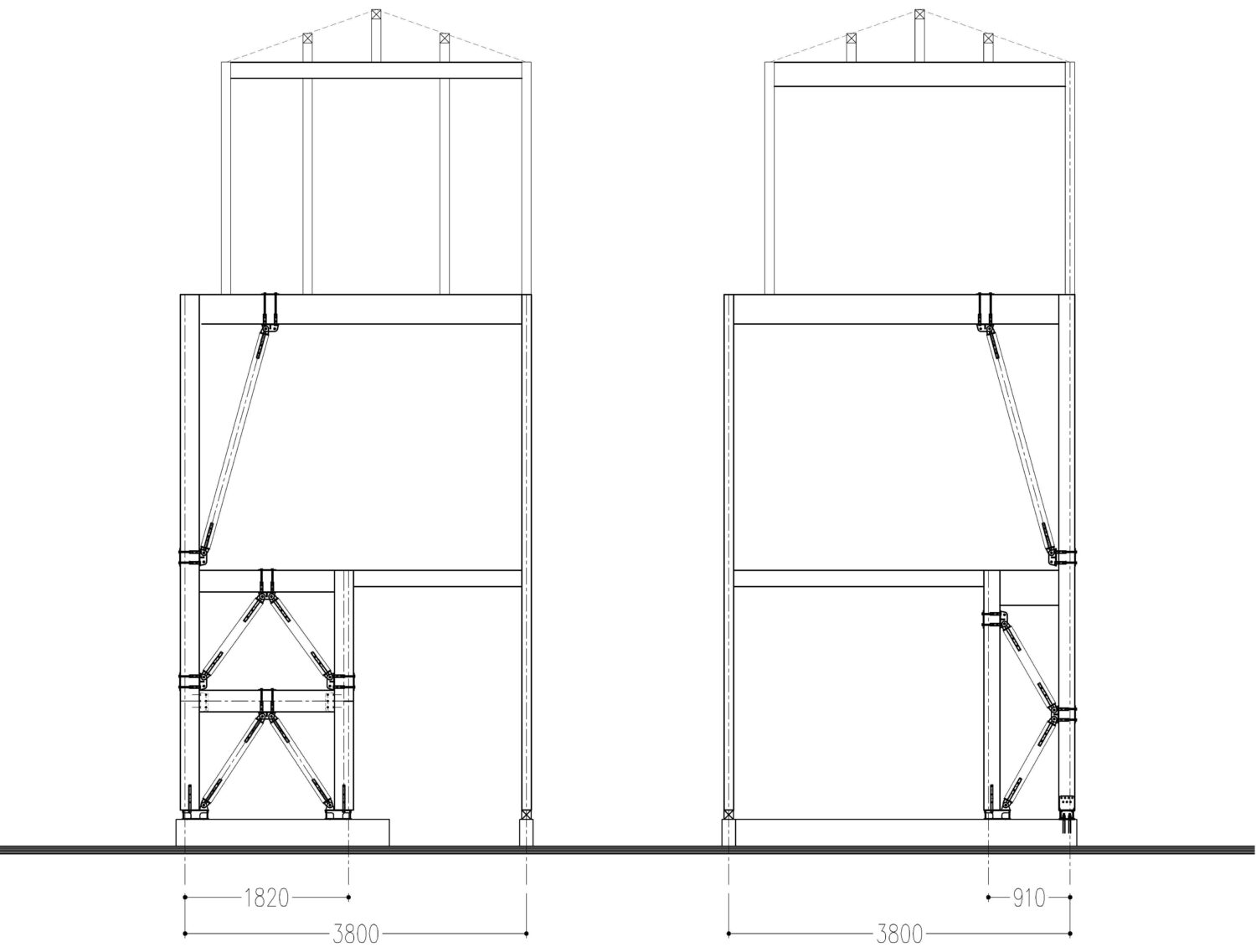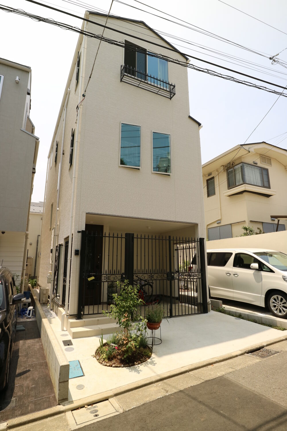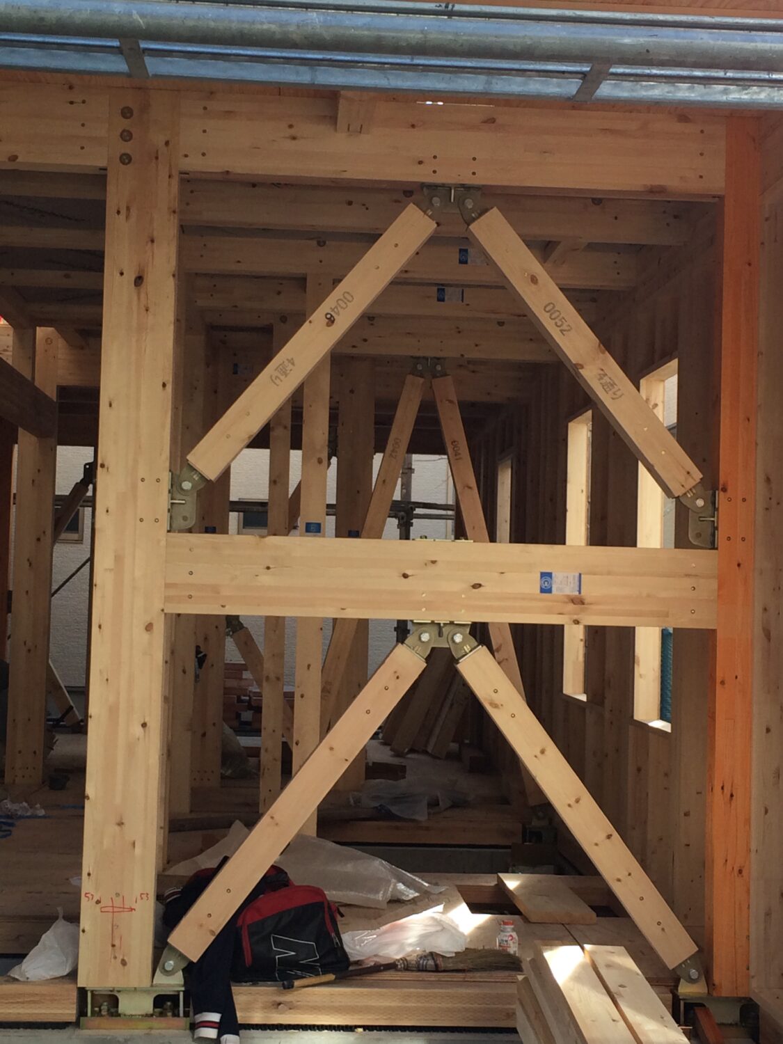 都内に建つガレージ付3階建て住宅の計画。耐震要素を十分に配置できないため、1階と2階の張間方向に高耐力木ブレースを配置した。3階は地震力が小さいためコストを考慮し張間方向も在来耐力壁にて計画。構造計算ルートは令46条2項ルートとして確認申請。木ブレースを活用することで2階は耐力壁の少ない広々としたLDKが実現できました。