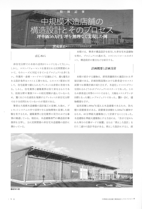 1つ目の記事では中規模木造店舗における構造計画の考え方や、坪単価を抑えつつ実現するための具体的な設計プロセスについて解説しています。